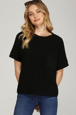 DROP SHOULDER SHORT SLEEVE SWEATER TOP WITH FRONT SIDE POCKET